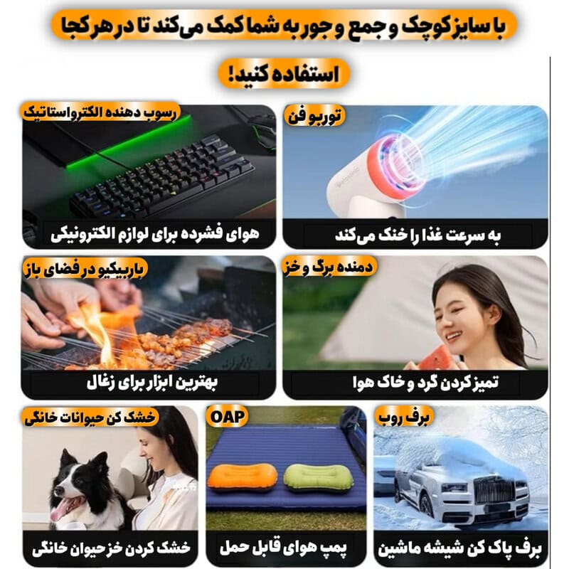 - کاربردهای متنوع: علاوه بر گردگیری، این دمنده هوا می تواند برای باد کردن وسایل، نگهداری تجهیزات کمپینگ، تمیزکاری قطعات مختلف، برف روبی و یخ زدایی نیز استفاده شود و به یک ابزار چند منظوره برای نیازهای مختلف تبدیل شود. اندازه جمع و جور آن نیز حمل آن را آسان می کند.