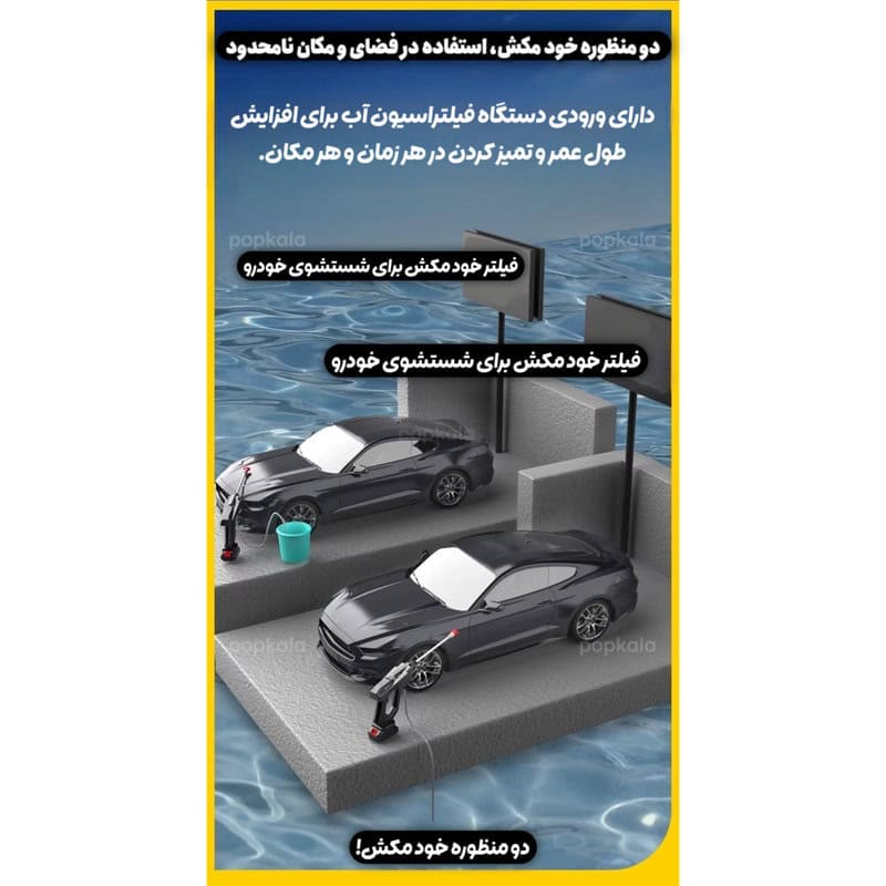 - دو منظوره خود مکش: این کارواش شارژی خانگی با بهرهگیری از ورودی فیلتراسیون آب، قابلیت مکش آب از منابع مختلف مانند سطل را دارا بوده و امکان استفاده از آن را در هر مکان و شرایطی فراهم میکند. این ویژگی طول عمر دستگاه را نیز افزایش میدهد.