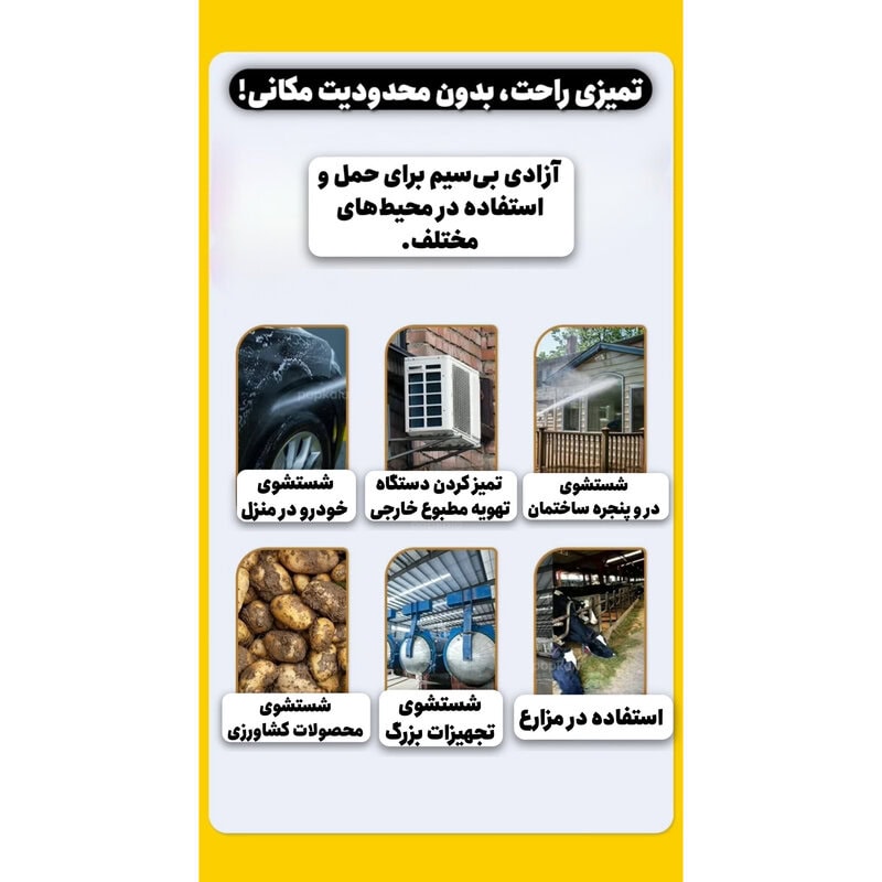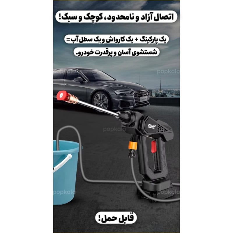 - اتصال آزاد و قابل حمل: طراحی کوچک و سبک این دستگاه به همراه عدم نیاز به اتصال مستقیم به شیر آب (به لطف قابلیت خود مکش)، حمل و نقل و استفاده از آن را در هر مکانی آسان میسازد. تنها به یک سطل آب و این دستگاه نیاز دارید تا یک کارواش قدرتمند در اختیار داشته باشید.