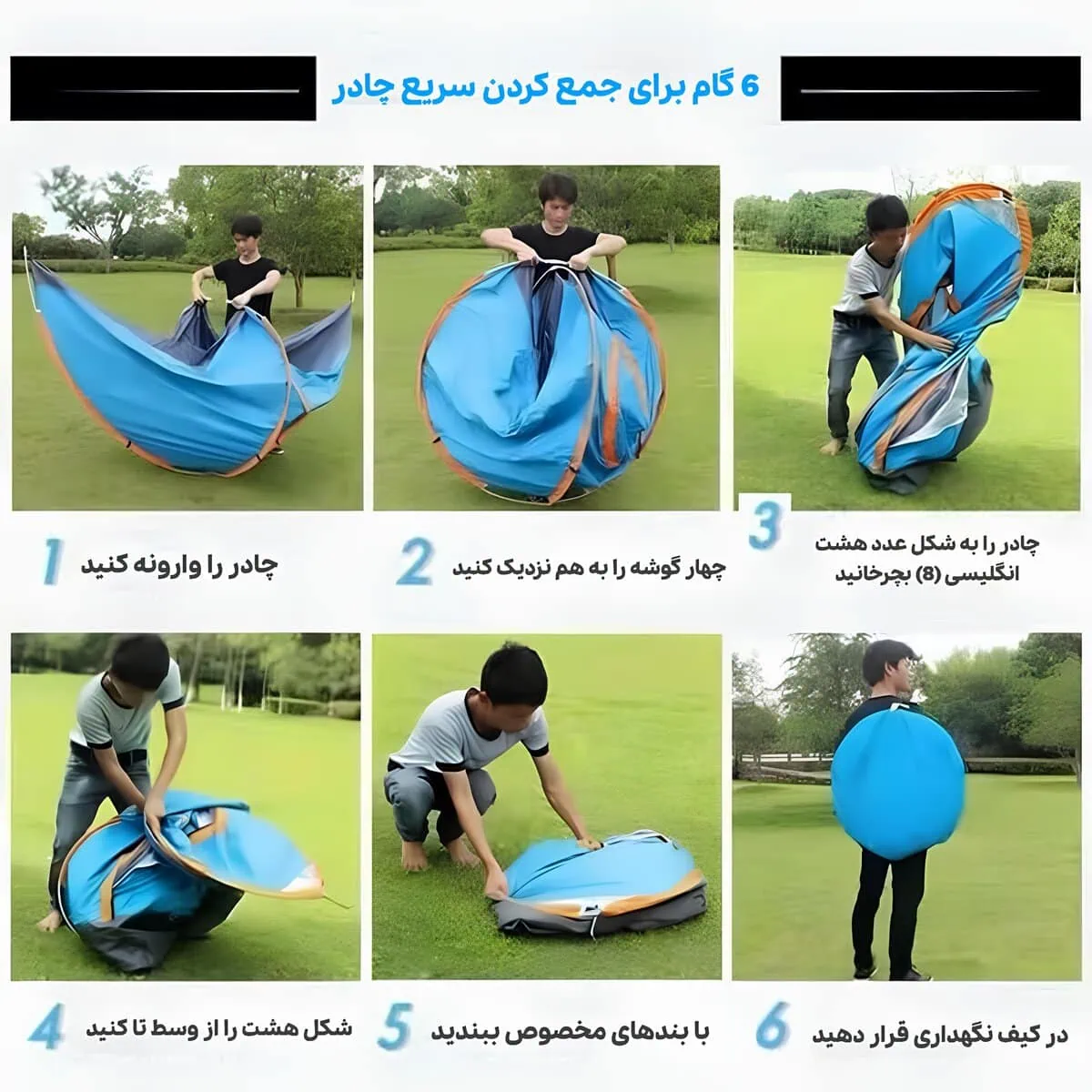 - آیا برای باز کردن چادر به مهارت نیاز است؟ نه. سیستم پاپ آپ با یک حرکت باز می شود. جمع کردن هم پس از یک بار تمرین به راحتی انجام می شود.