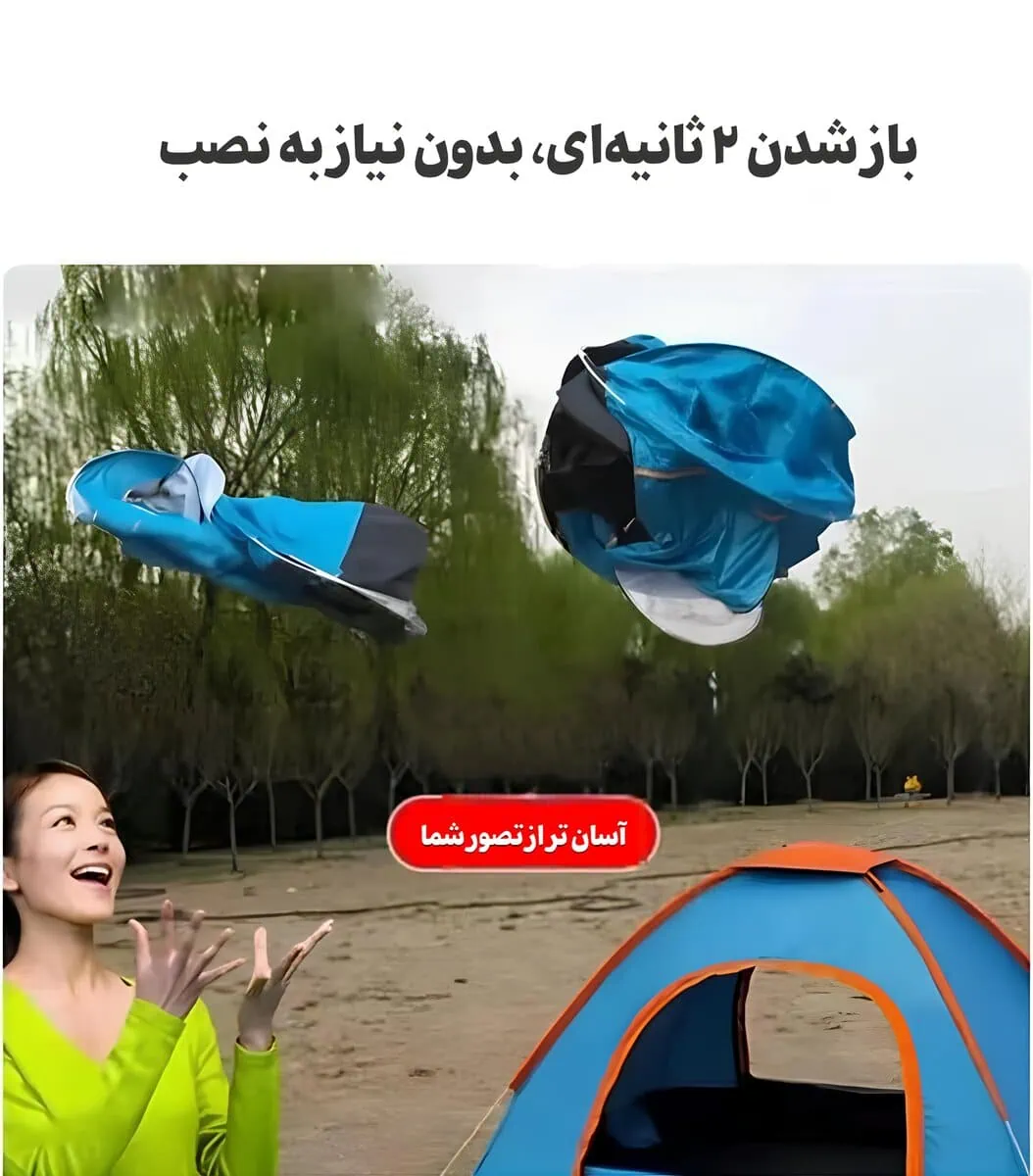 - سازه فنری بلافاصله باز شده و چادر آماده استفاده است.