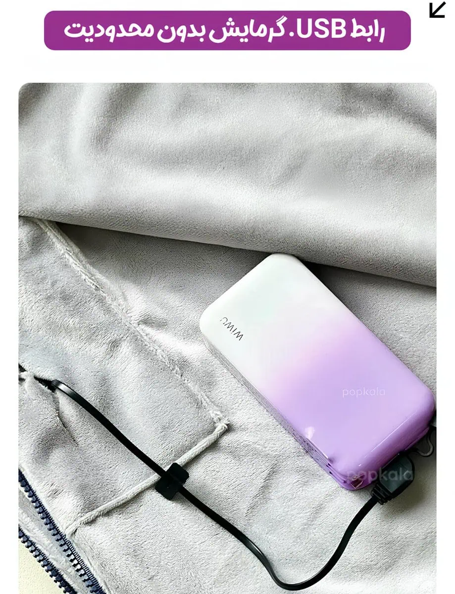 - قابلیت حمل و استفاده چند منظوره: به دلیل وزن بسیار کم و عدم نیاز به پریز برق مستقیم، این شال حرارتی قابل حمل را می توان در هر جایی استفاده کرد. کافی است آن را به یک پاور بانک متصل کنید تا در حین پیاده روی، رانندگی یا کار با کامپیوتر از گرمای آن لذت ببرید.