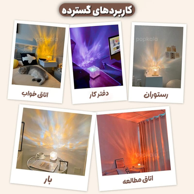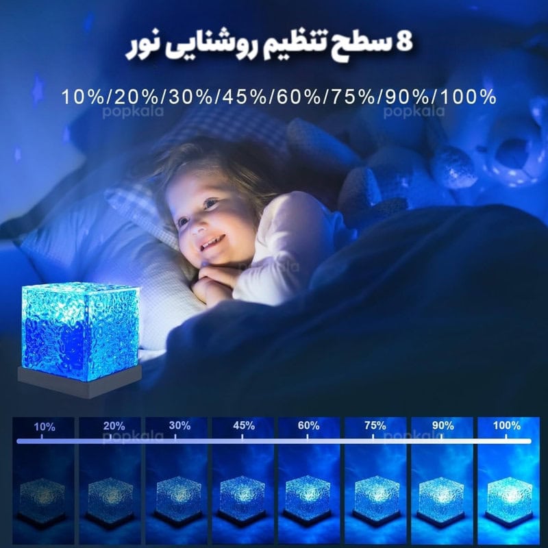 چراغ خواب مکعبی شبیه ساز آب، یک چراغ خواب دکوری و مدرن با طراحی خاص و نورپردازی 360 درجه ایه که فضای اتاق رو به شکلی جادویی و آرامش بخش متحول می کنه. این چراغ با پخش موج های نوری شبیه امواج دریا و شفق قطبی روی دیوار و سقف، محیطی رومانتیک، گرم و آرام رو فراهم می کنه.