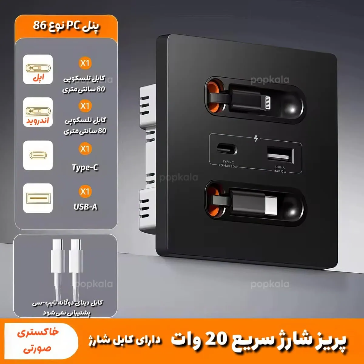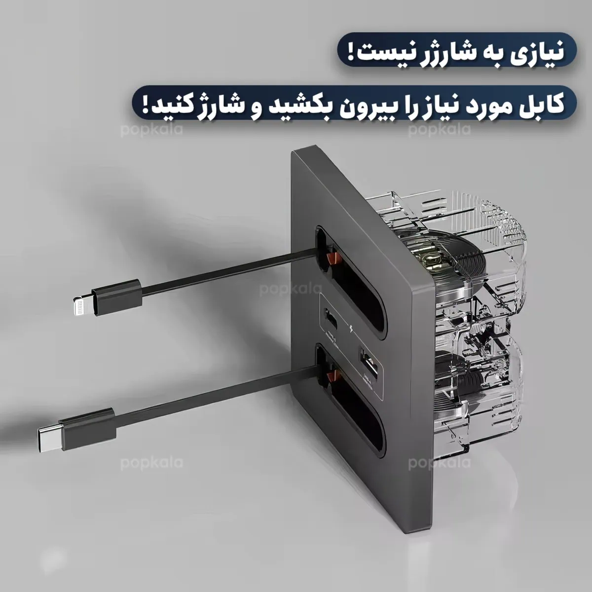 از کابل های Lightning و USB-C با فناوری PD پشتیبانی می کند. دو کابل اصلی به صورت داخلی در بدنه پریز تعبیه شده اند تا نیاز به کابل جداگانه نباشد.